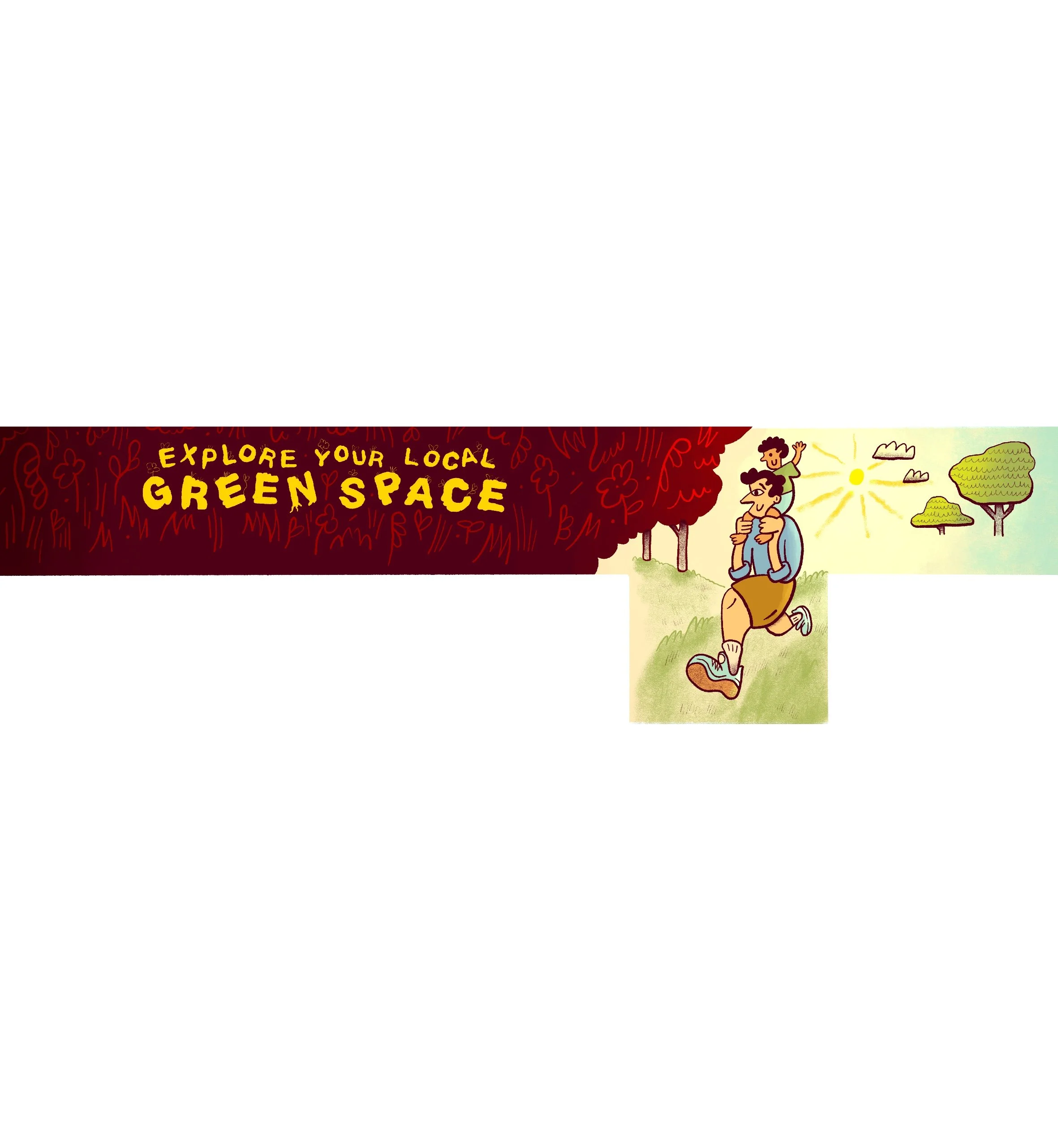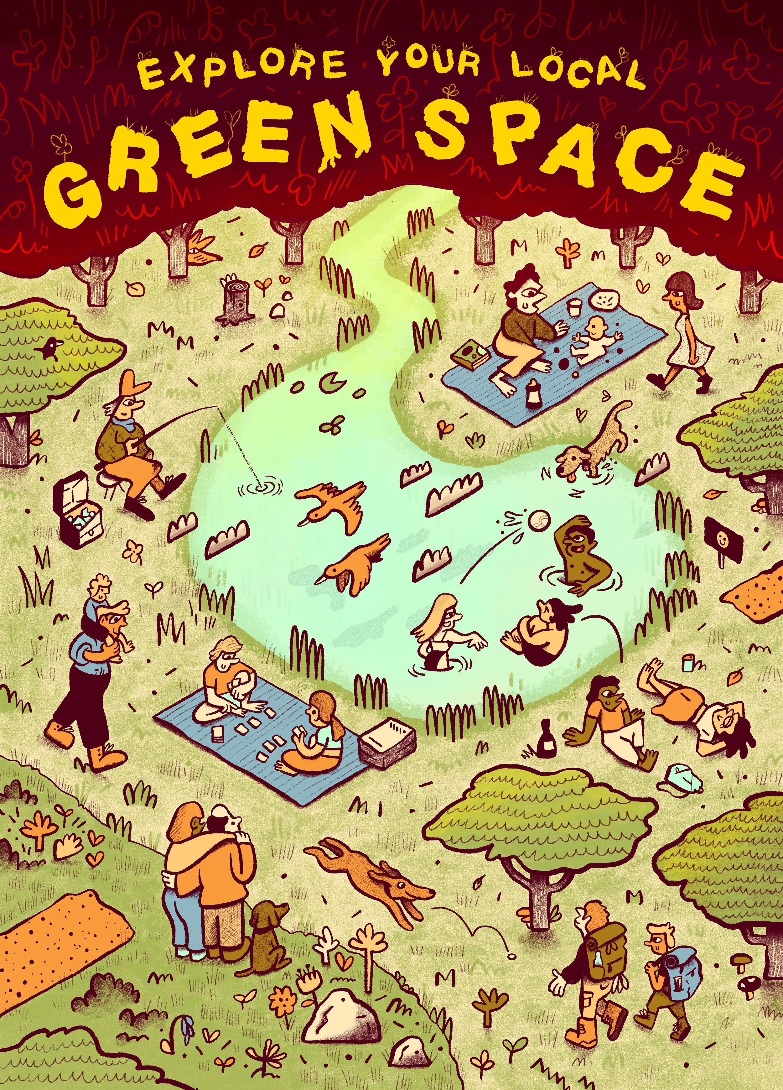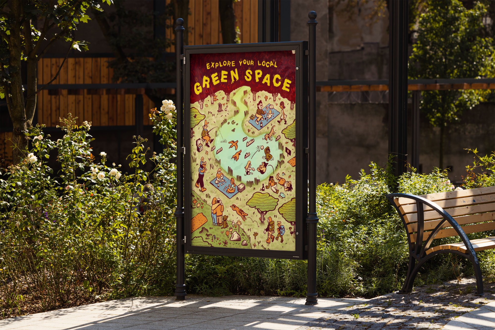 A self-initiated project imagining a council-led campaign to encourage people to reconnect with their local parks. I created a poster, bus advert and sticker - all designed to feel warm, playful and rooted in community.